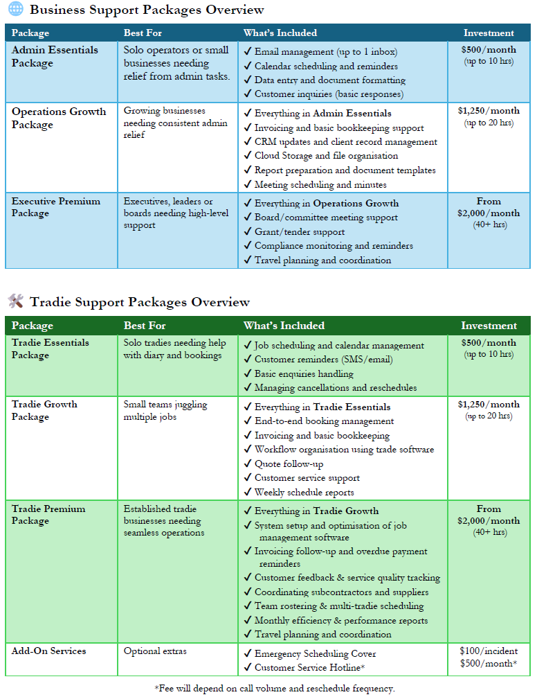 From solo operators to busy tradie teams, I provide reliable admin and scheduling support — so you can stay focused on the work that matters most. No lock-in contracts, just reliable support when you need it.